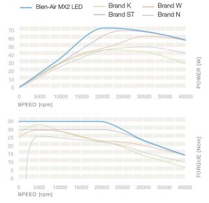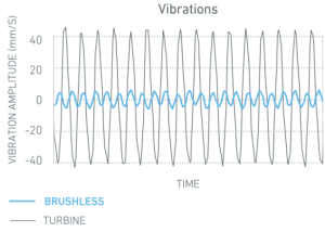 Even with a substantial increase in torque (and speed) when you switch from air to electric, the vibrations (and the possibility of chattering) is still greatly reduced when using a brushless motor compared to an air turbine as you can see on the graph, above (click to enlarge).