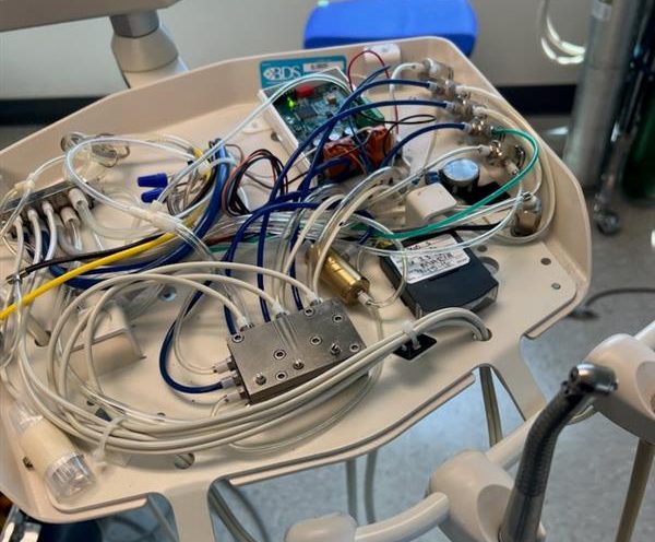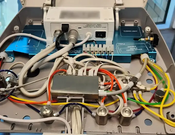 The image provided showcases the inner-workings of a dental unit. You’ll notice at the back of the unit is a controller box that has been professionally installed within the dental unit.