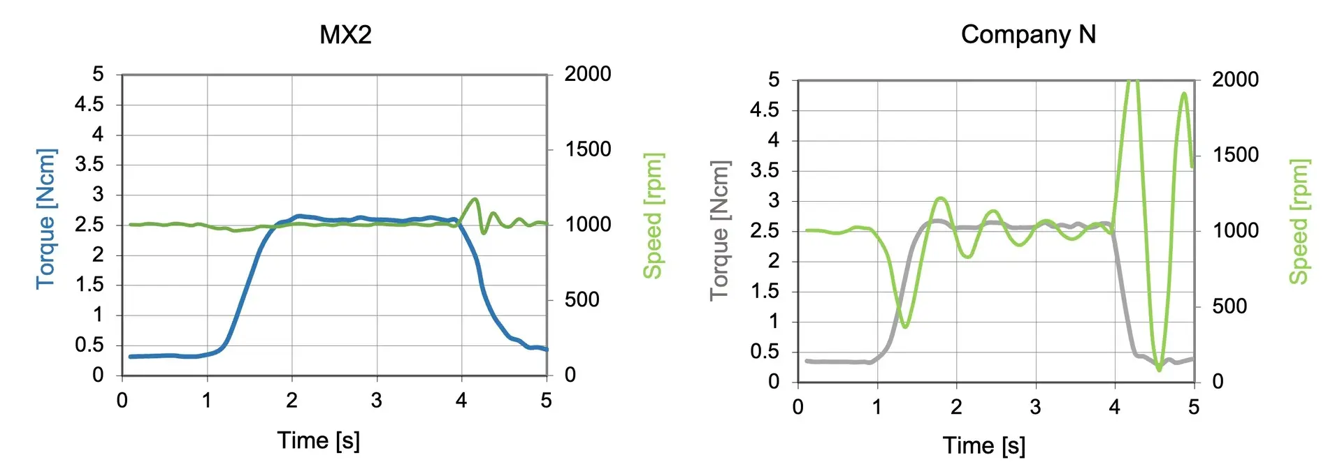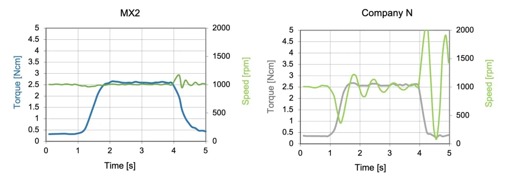 As you can see from the charts (click to enlarge), power is measured in both Watts (power) and Ncm (torque). More importantly, you can also see there is a difference in every product’s ability to generate torque at low speeds (this is more apparent in the bottom chart).
